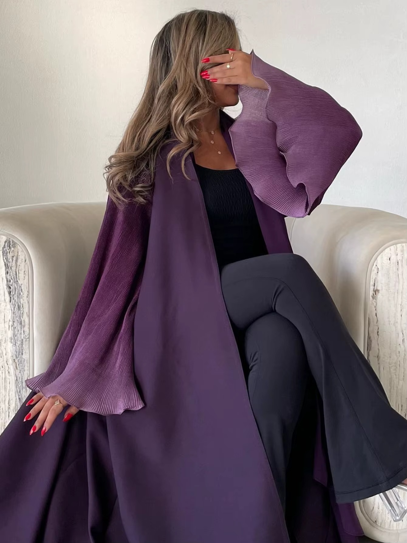 عباية مفتوحة من قدّام بتفاصيل أكمام مضيّة تعطيك لمسة أنوثة وأناقة بدون تكلّف. جاية بستايل عربي غير رسمي، وتجمع بين روح القفطان التركي وشكل الجلابية العصرية. قصّتها ماكسي وانسيابية، وتناسب لبس اليوم العادي أو الطلعات المسائية الخفيفة.